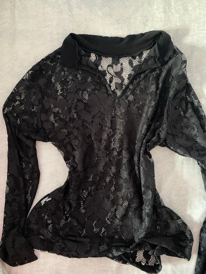 Dantel kumaştan yapılmış, V yaka ve uzun kollu siyah gotik bluz. Midi uzunluğunda, uyumlu kesimli ve modaya uygun avant-garde tarzda.