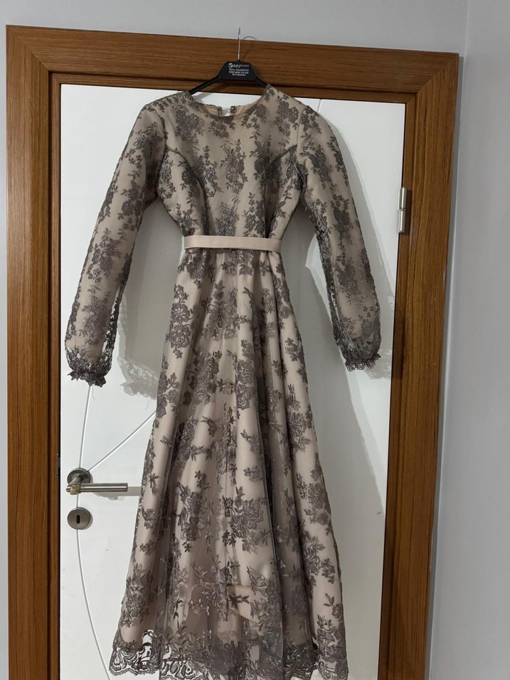 Dantel detaylı, uzun kollu ve bol kesim bej elbise. Modern klasik tarzıyla düğünlere uygun vintage görünümlü uzun elbise.
