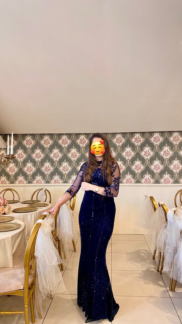 Uzun ve vücuda oturan lacivert abiye elbise, dantel detayları ve V yaka ile dikkat çekiyor. Uzun kollu ve batik desenlidir, şık gece davetleri için uygundur.