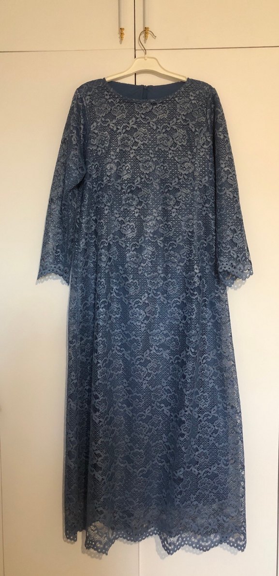 Uzun, bol kesim elbise, tekne yaka ve uzun kollu, sentetik kumaş ve ince dantel detaylı lacivert. Sade, vintage bohem tarzıyla düğünlere uygun. Bir defa giyildi özel dikimdir.