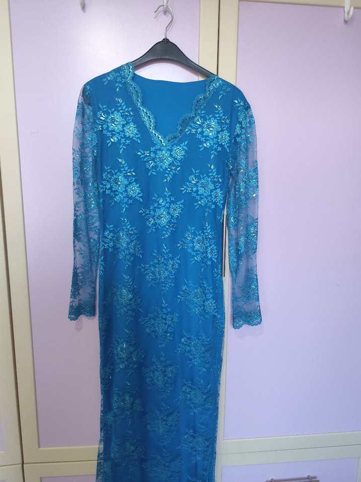 Uzun, v yaka ve dantel detaylı, parlak mavi renkte, uzun kollu, bağlama desenli, modest bohem tarzında, düğünlere uygun dar kesim henna elbise. Özel dikimdir.