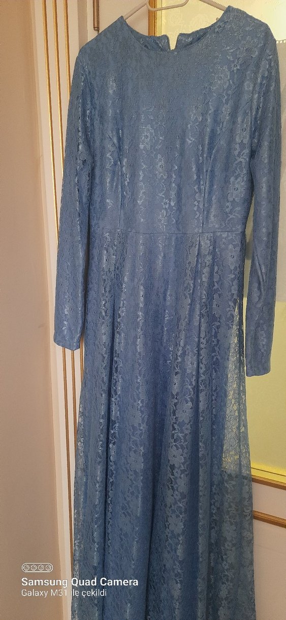 Dantel Detaylı Uzun Mavi Kadın Elbise
