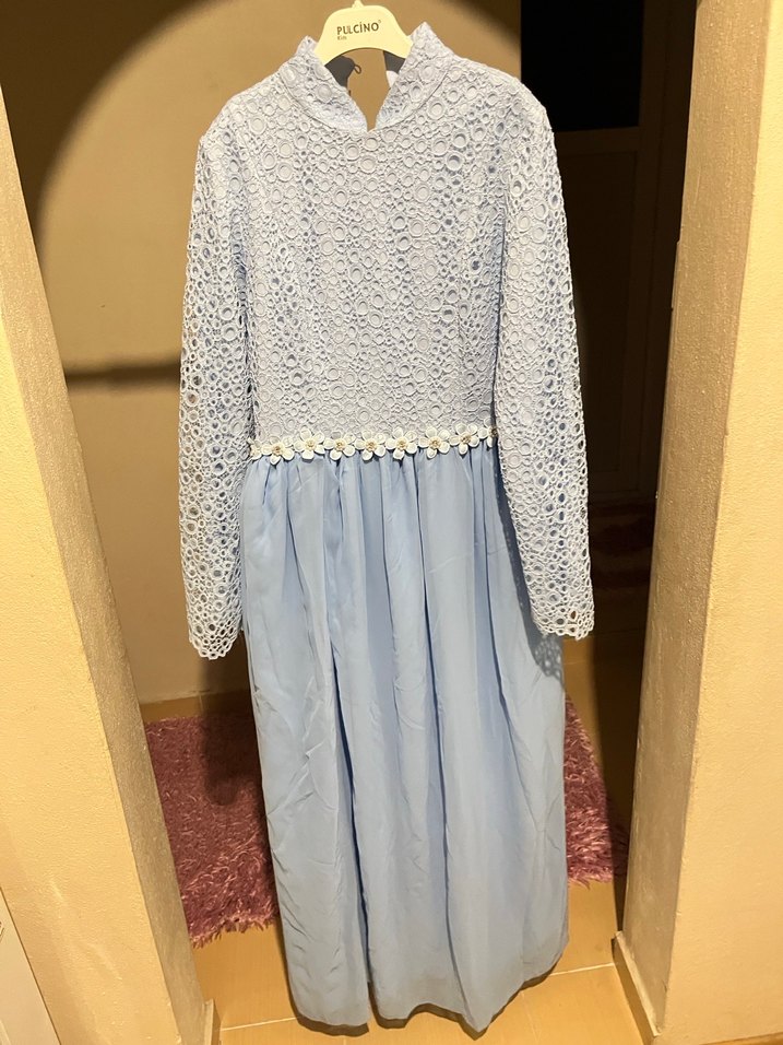 Dantel detaylı, uzun kollu, mavi ve pastel tonlarda, bol kesim kadın elbisesi. Üst kısmı örme kumaş ve yuvarlak yaka ile tamamlanmıştır.
