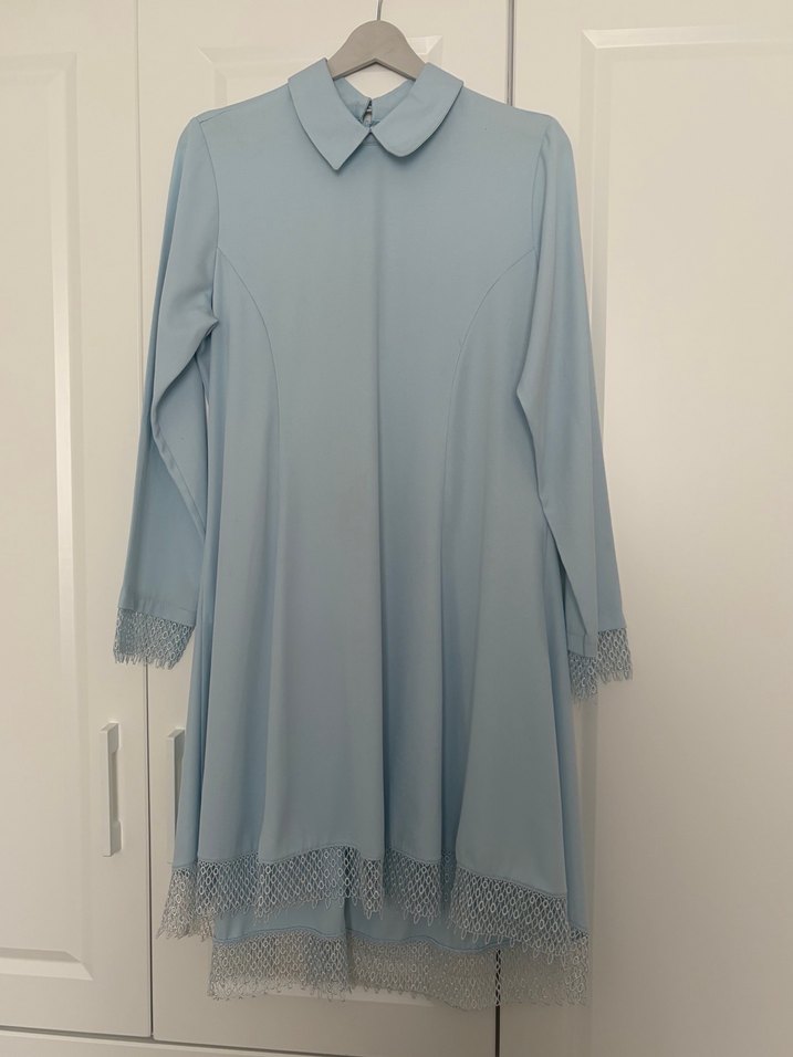 Pastel mavi renkte, uzun ve bol kesimli kadın tunik. Uzun kollu, yakalı ve kol ile etek uçlarında ince dantel detaylı, ofis kullanımı için uygun.