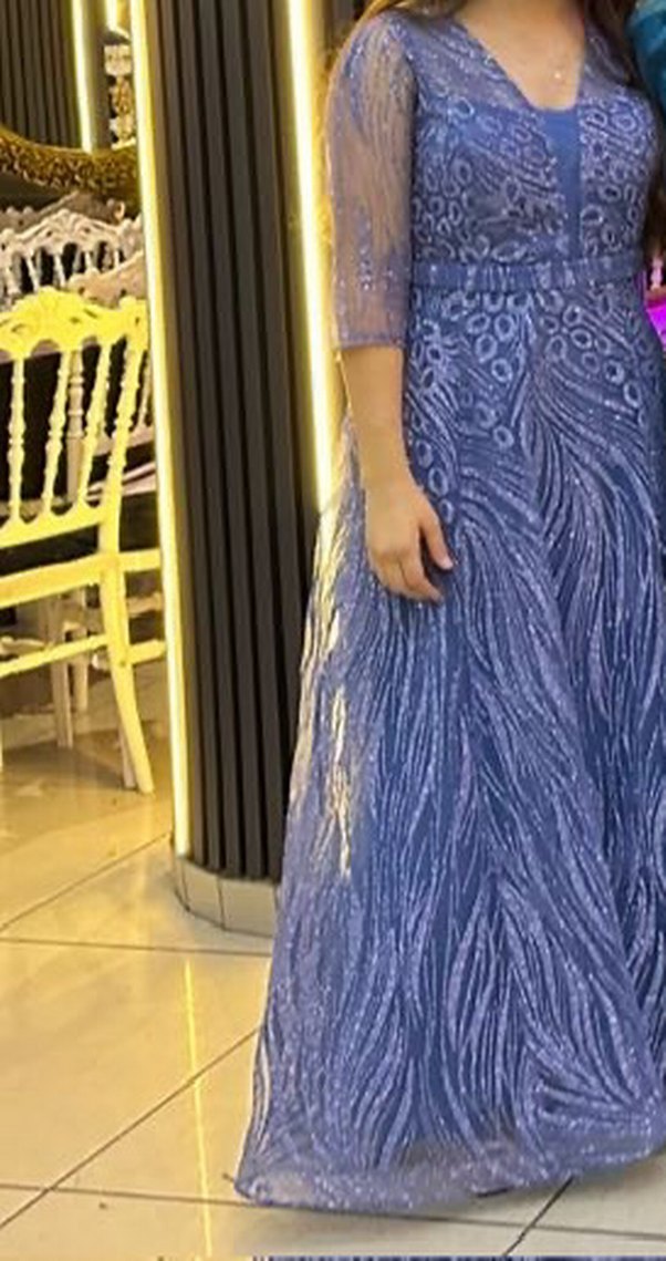 Dantel Detaylı Uzun Mavi V Yaka Elbise