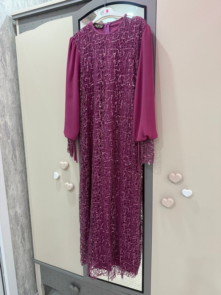 Dantel detaylı, uzun ve bol kesim mor abiye elbise. Uzun kollu, yuvarlak yakalı ve hafif batik desenlidir. Düğünler için uygundur.