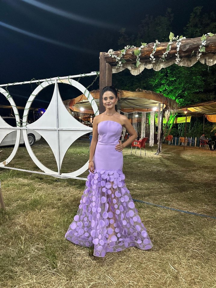 Uzun mor straplez elbise, dantel detayları ve hafif batik desenleriyle bohem ve göz alıcı bir görünüm sunar.