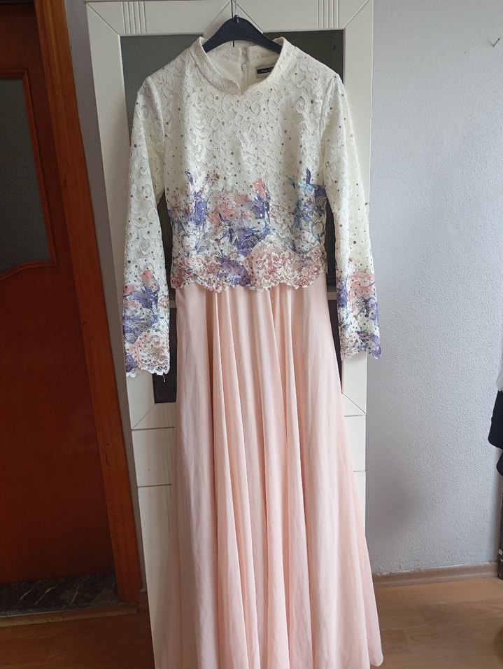 Uzun, straplez pembe etekli ve bol kesim nişan elbisesi. Dantel uzun kollu üstü çiçek işlemeli, modern klasik ve bohem tarzı yansıtıyor.