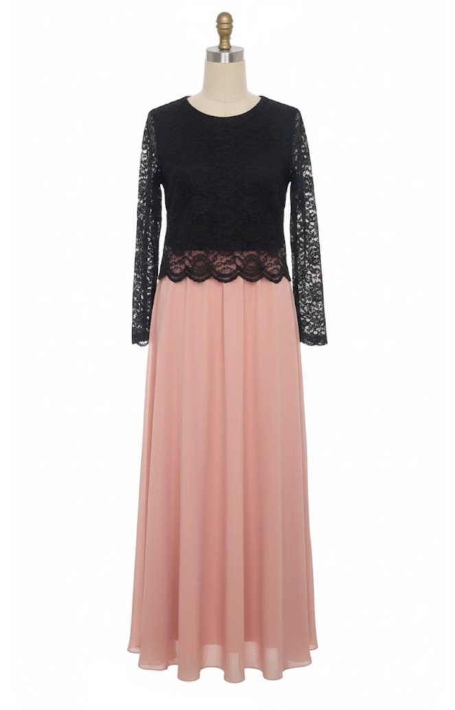 Dantel Detaylı Uzun Pembe Siyah Abiye Elbise