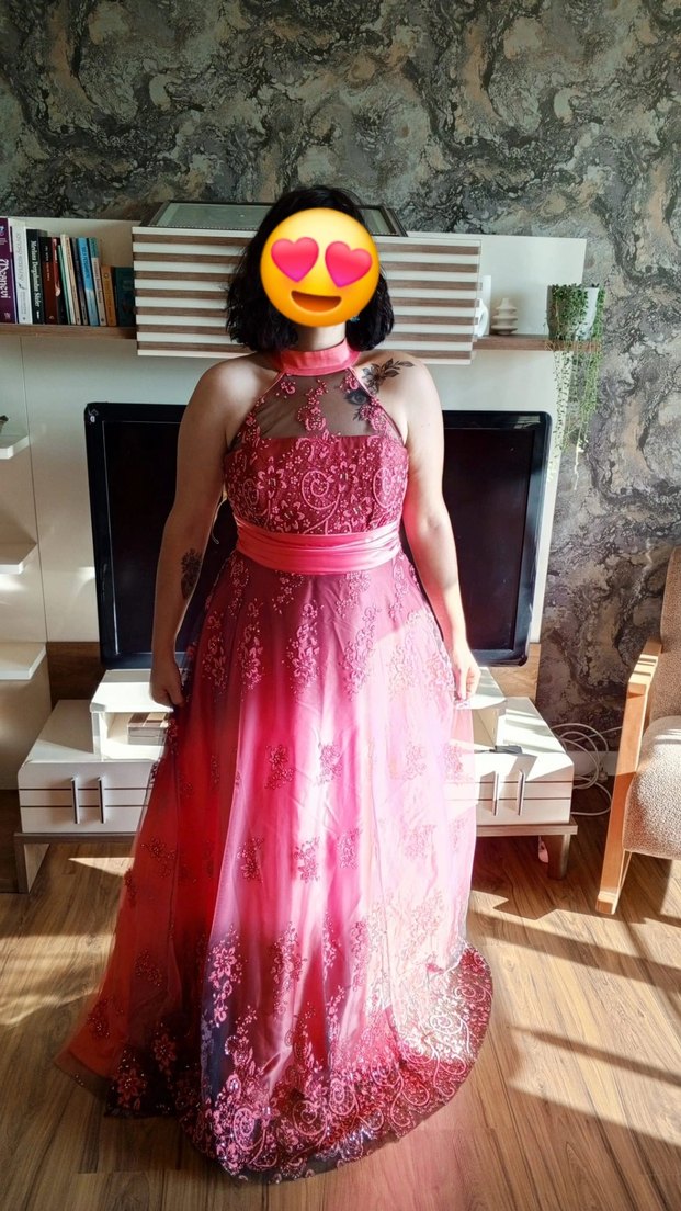 Dantel detaylı, straplez yakalı ve desenli uzun pembe abiye elbise, gösterişli partiler için uygundur. 38-40 bedene uygundur