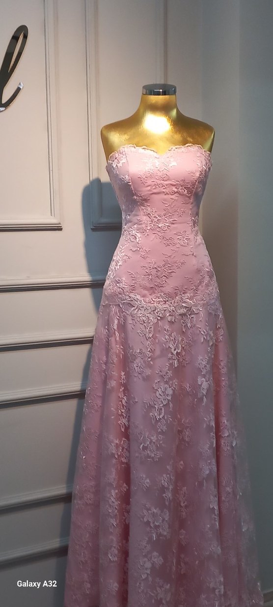Uzun, straplez, pastel pembe renkte dantel işlemeli kadın abiye. Kolsuz, regular fit ve modern klasik tarzda, düğünler için uygun.