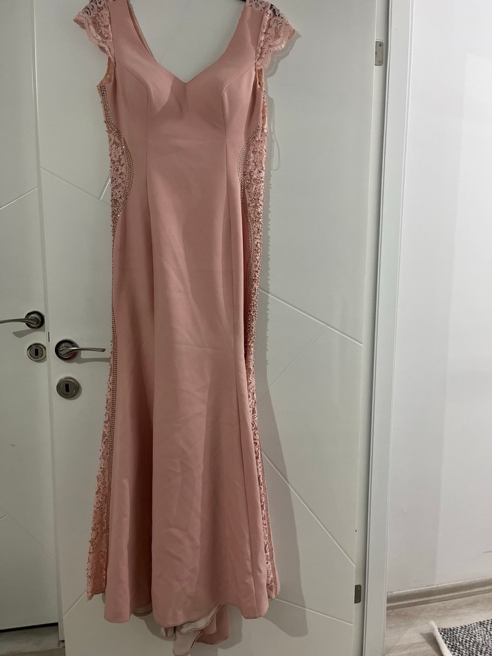 Dantel Detaylı Uzun Pembe V Yaka Abiye Elbise