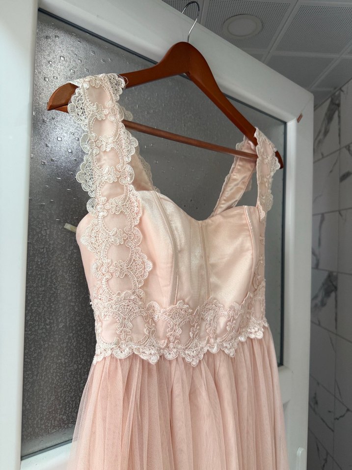 Dantel askılı, işlemeli detaylara sahip uzun, pembe vintage elbise. Straplez yaka ve kolsuz tasarımıyla klasik bir şıklık sunar.