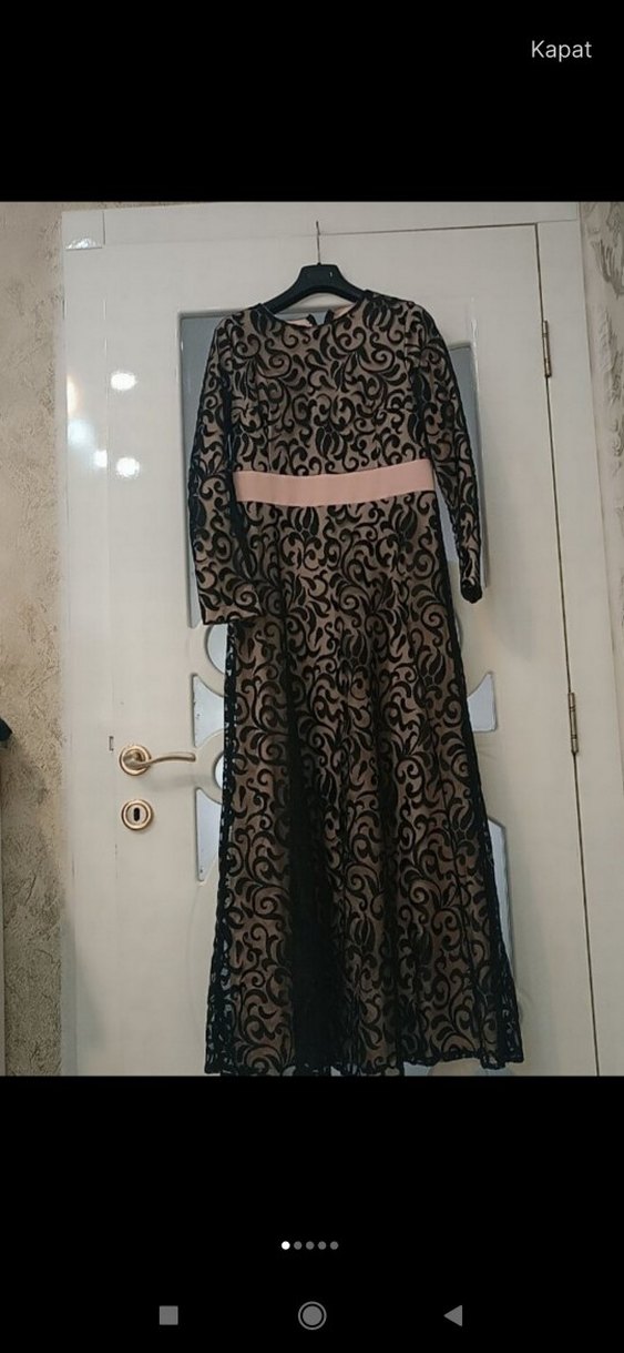 Uzun siyah abiye elbise, dantel detaylı ve kayık yaka. Regular fit, askılı kollarla klasik ve gotik tarzı birleştirir. Düğünler için uygun.