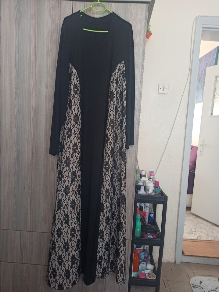 Uzun kollu, siyah elbise, yanlarda dantel detaylı uygulamadan aldım bol geldiği için satıyorum