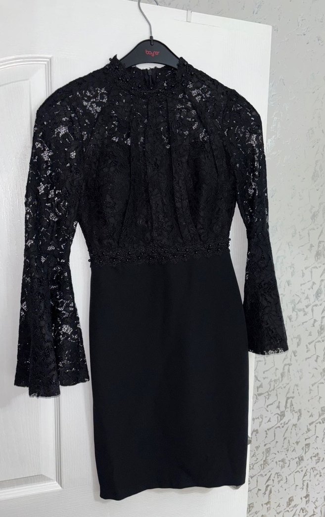Yüksek yakalı, pedli, dantel detaylı uzun kollu ve vücuda oturan siyah gece elbisesi.