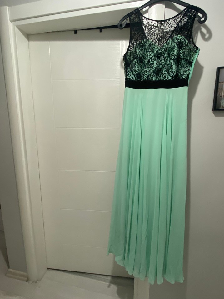 Siyah dantel detaylı, kolsuz, uzun yeşil abiye elbise. İnce kesimi ve pastel tonlarda şık etek kısmı ile özel davetlere uygundur.