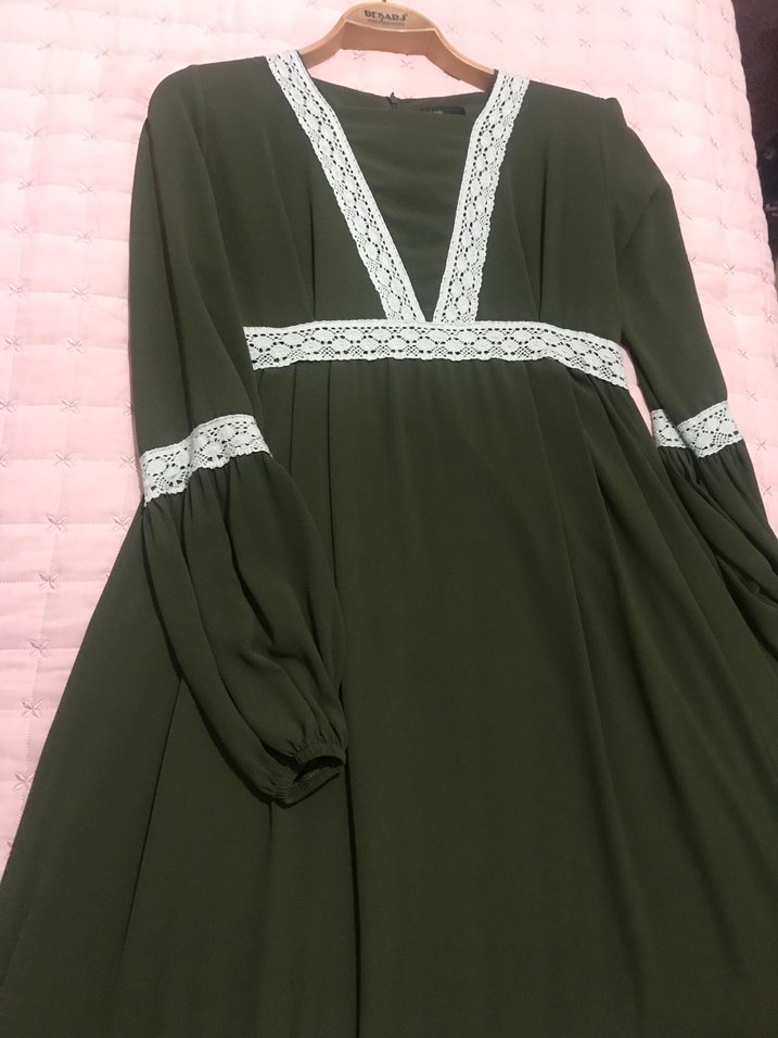 Bu uzun yeşil elbise, dantel detaylı V yakaya, lastikli uzun kollara ve bol kesime sahiptir. Yumuşak sentetik kumaştan üretilmiştir, mütevazı ve bohem tarzlara uygundur.