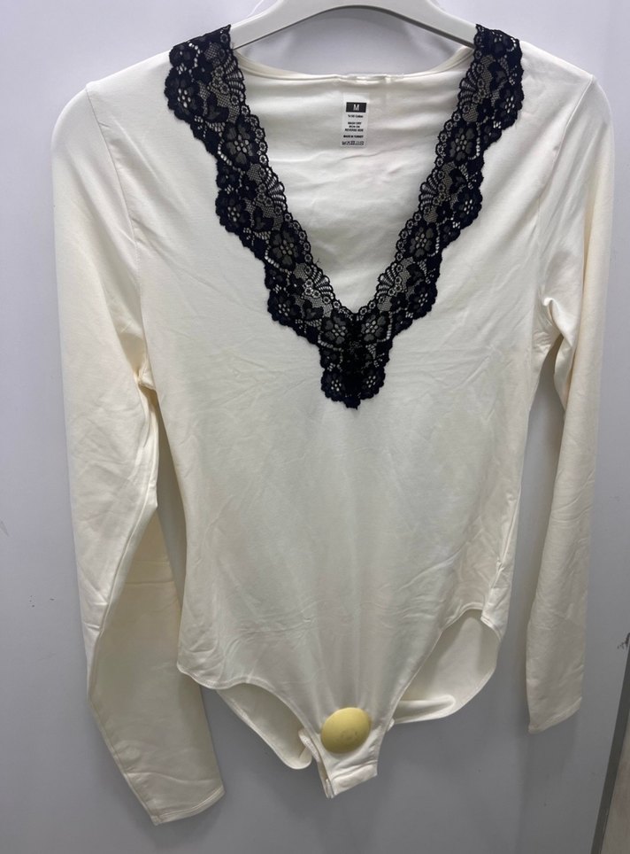 V yaka, siyah dantel detaylı beyaz, uzun kollu, ince ve hafif sentetik kumaştan yapılmış bohem tarzda, dar kesim bluz.