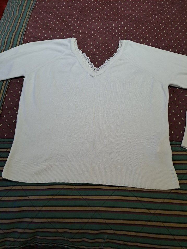 Pamuk kumaştan yapılmış, dantel detaylı V yaka beyaz kadın kazak. Uzun kollu ve bol kesimdir, günlük kullanım için uygundur.