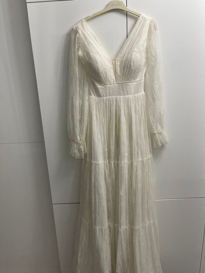 Dantel detaylı, V yakalı beyaz uzun elbise, yumuşak keten kumaştan. Uzun kollu ve bol kesimli, bohem düğünler için uygun.