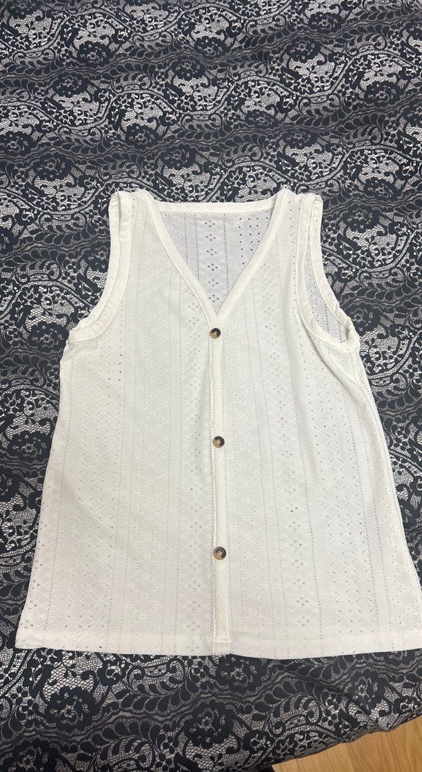 Pamuklu, dantel detaylı, V yakalı beyaz kolsuz yelek. Bol kesimi ve düğmeli kapanışı ile bohem tarzına uygundur.