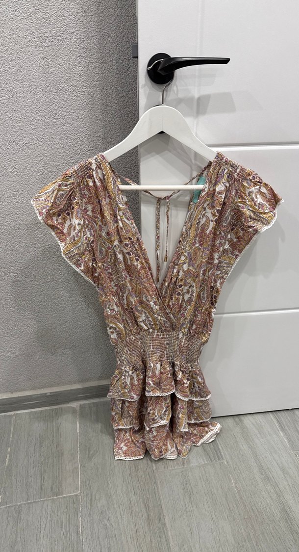 Kahverengi bohem mini elbise, V yaka, dantel detaylı ve bol kesimlidir. Kolsuz ve kısa boyda, günlük kullanıma uygundur. Hafif sentetik kumaştan üretilmiştir.