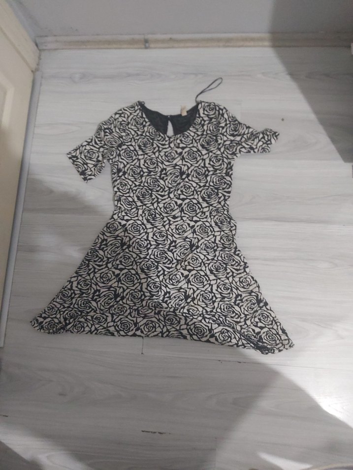 Gri midi elbise, kısa kollu ve V yakalıdır. Baskılı deseni ve dantel detaylarıyla, yumuşak sentetik kumaştan üretilmiştir, günlük sokak modasına uygundur.