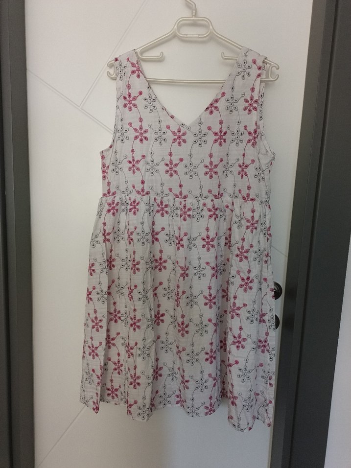 Dantel detaylı, V yaka ve kolsuz hamile midi elbise. Pastel beyaz renkli, baskılı çiçek desenli ve bol kesim vintage bohem tarzı sunar. Günlük kullanıma uygundur.