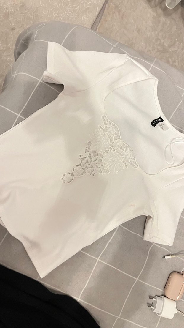 Beyaz, kısa kollu ve V yakalı, dantel detaylı baskılı hamile tişörtü. Yumuşak sentetik kumaştan, günlük sokak stili için uygun.