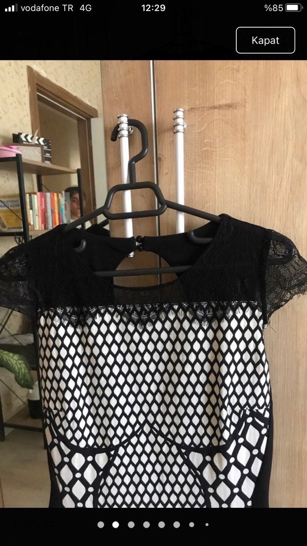 V yaka ve dantel detaylı askılı kollara sahip, fitted kesim midi elbise. Siyah beyaz baskılı ve gotik tarzda.