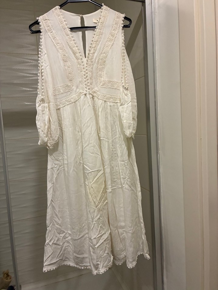 Pamuk kumaştan, dantel detaylı, V yakalı ve bol kesimli uzun beyaz elbise. Bohem ve düğünler için uygun.