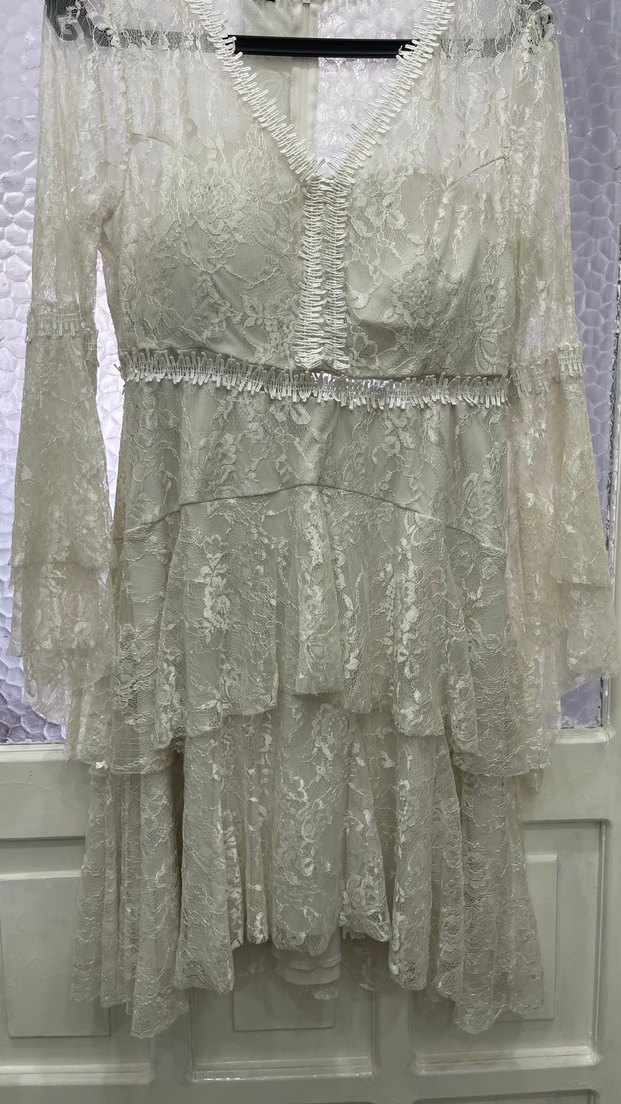 Bej renkte, dantel ve nakış detaylı, V yaka, askılı kollu, bol kesim uzun bohem tarzda nişan elbisesi. Vintage ve şık tasarım, düğünler için uygun. Ürün 1 kez giyildi bir deformesi yoktur
