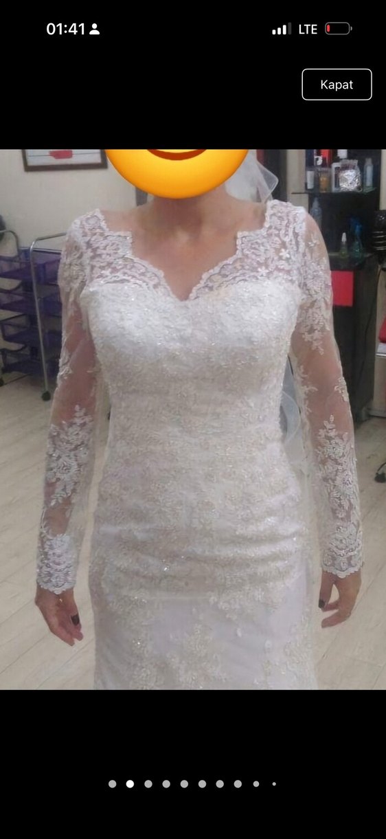 Beyaz renkte, dantel detaylı V yaka, uzun kollu, oturan kesim A-line gelinliktir. marka temsilidir. bir iki tadilat dışında hiçbir sorunu yoktur.