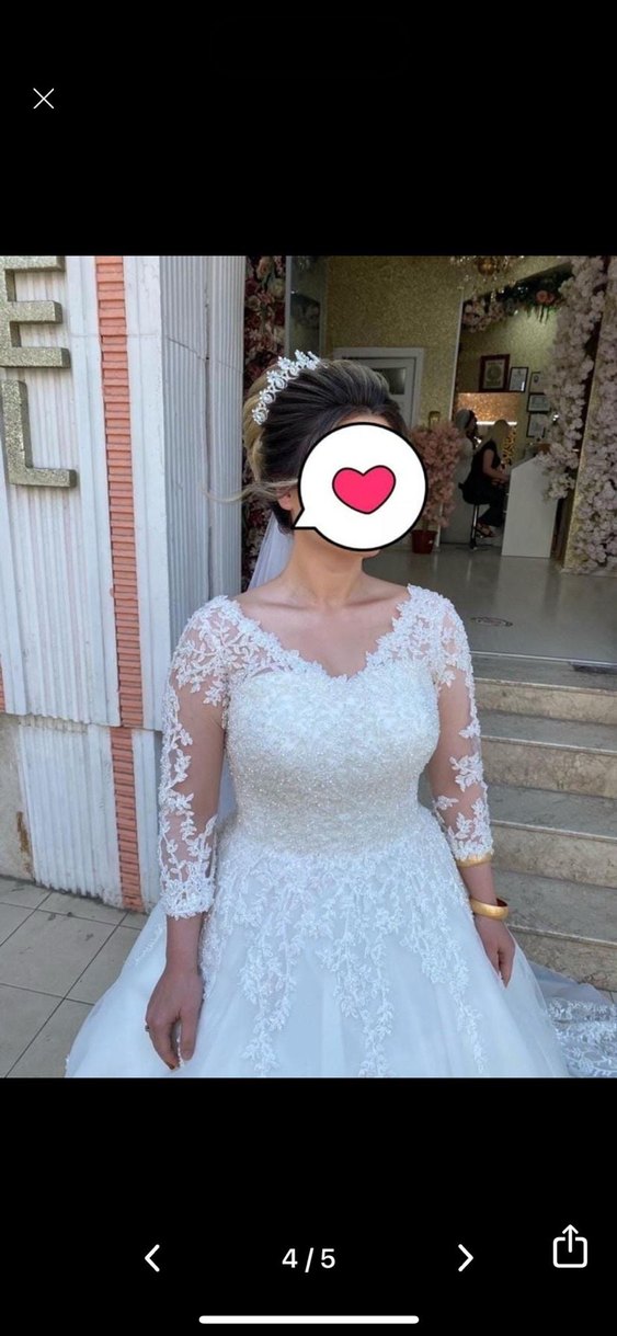 Beyaz prenses kesim gelinlik, V yaka ve uzun dantel kollara sahip, klasik zarafeti yansıtır. 38 bedendir ciddi alıcılar makul tekliflere her zaman açığım iki kol arası 50 bel 40