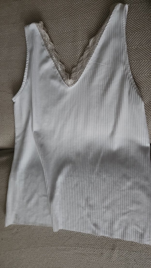 Dantel detaylı V yakalı beyaz, kolsuz atlet. Yumuşak sentetik kumaştan, vücuda oturan ve normal boyda, günlük kullanıma uygun.