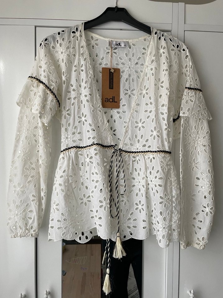 Pamuklu, dantel işlemeli, V yakalı, uzun kollu beyaz bluz. Bol kesim ve kısa boy, günlük kullanım için uygun.