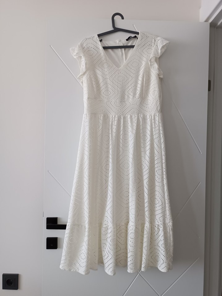 Dantel detaylı, V yakalı ve askılı kollu beyaz elbise. Pamuklu, bol kesim ve bohem tarzda. tertemiz sorunsuz