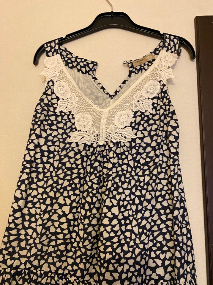 Pamuk kumaştan, bol kesim ve kolsuz mini elbise. V yaka ve beyaz dantel detayları ile bohem tarzını yansıtır. Koyu renk baskılı desene sahiptir.