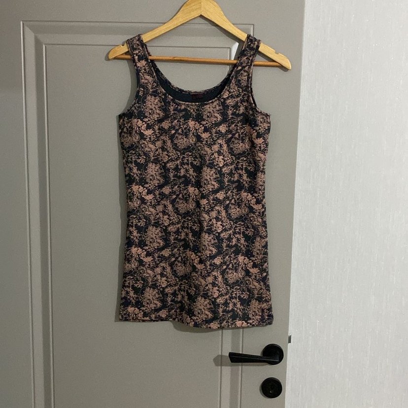 detaylı, V yakalı, sentetik kumaştan yapılmış, koyu kahverengi batik desenli, kadınlar için dar kesim atlet. Rahat sokak stili için uygun.