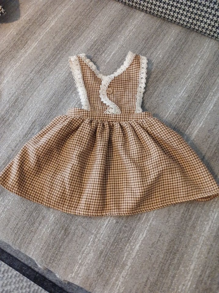 Dantel detaylı V yakalı, kahverengi kareli, örme kumaştan yapılmış, kolsuz ve bol kesim kız çocuk elbisesi.