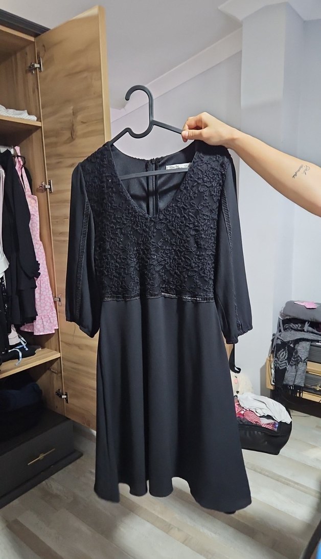 Dantel detaylı, V yakalı siyah midi elbise. Bol kesim ve askılı kollara sahip, romantik buluşmalar için uygun.