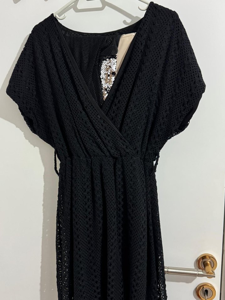 Siyah triko elbise, V yaka ve kısa kolludur. Nakışlı dantel detayları ve bol kesimiyle bohem tarzını yansıtır. Uzun boyda, günlük kullanıma uygundur.