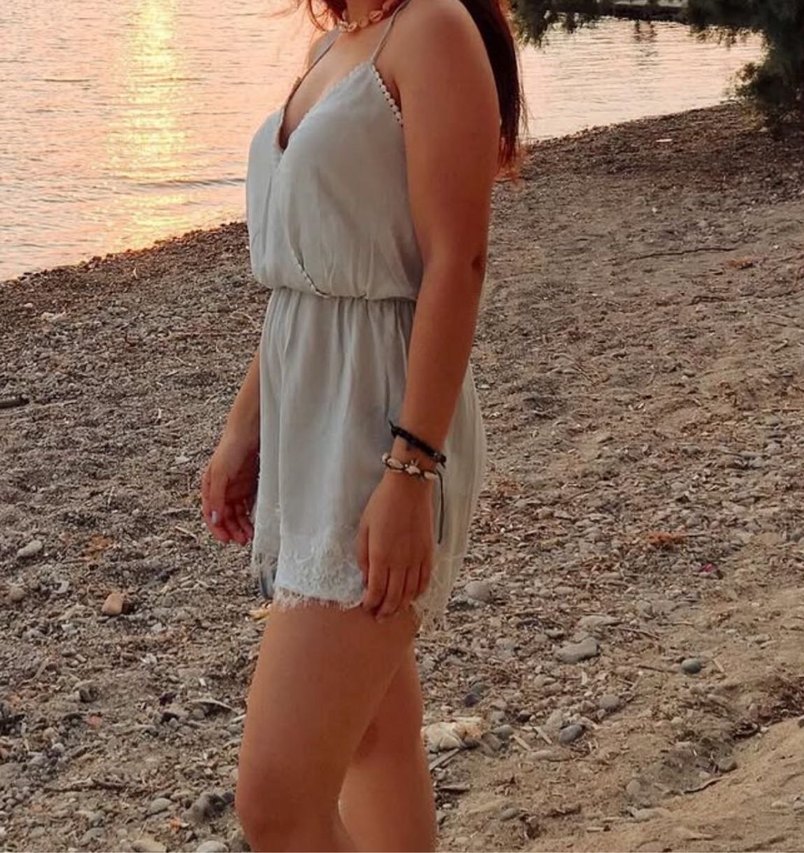 Mint yeşili buz mavisi tonda renk, dantel detaylı, V yakalı, askılı kısa ve bol kesim tulum. Denim kumaştan, sokak modasına uygun ve açık hava kullanımı için ideal.