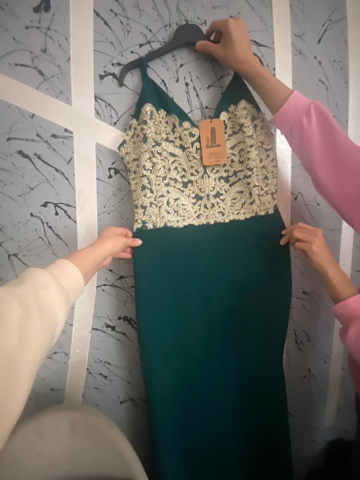 V yakalı, kolsuz ve dantel detaylı uzun yeşil abiye elbise. Vintage ve bohem tarzı yansıtan baskılı deseniyle düğünler için uygun. sıfır etiketli ürün