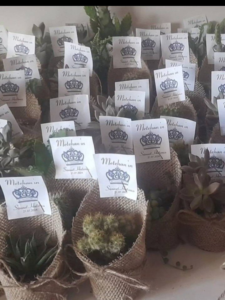 Dantel ve rustik kumaşla sarılı, kişiye özel kartlı yeşil ve gri bohem düğün hediyelikleri. Doğal dokular ve vintage stil.