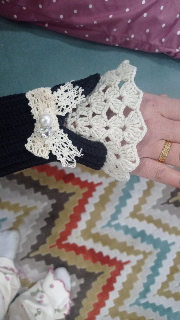 Hafif beyaz renkli, dantel detaylı vintage kadın eldiveni. İnce örgü ve inci süslemeli fiyonk ile bohem tarzı yansıtıyor.