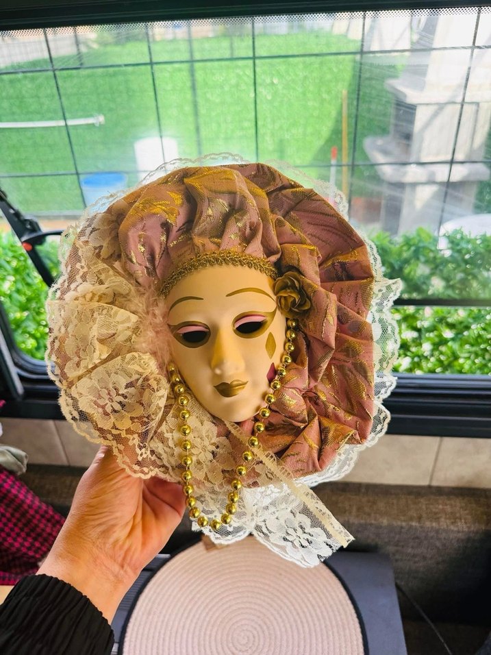 Dantel detaylı, kumaş süslemeli vintage tarzda dekoratif maske. Altın renkli boncuk zinciri bulunur. Gösterim veya kostüm için uygundur.
