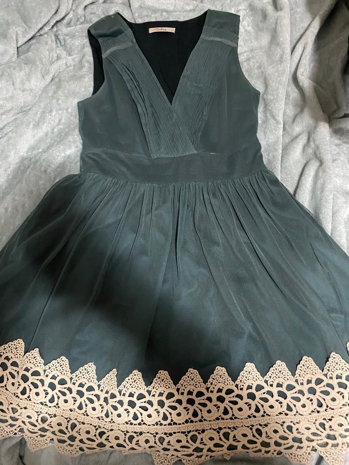 Herhangi bir kusuru yoktur. 36 beden, kolsuz, v yaka, dantel işlemeli etek ucu detaylı, vintage esintili yeşil midi elbise. Bohem tarzda, klasik şıklık sunar.