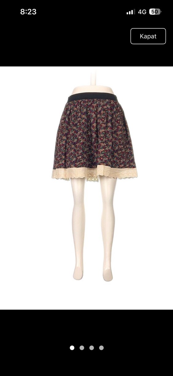 Bohem tarzda, sentetik kumaştan, çok renkli koyu çiçek desenli, dantel detaylı ve bol kesim midi etek. Bel:38 Uzunluk 46cm. S ve M bedene uygundur.